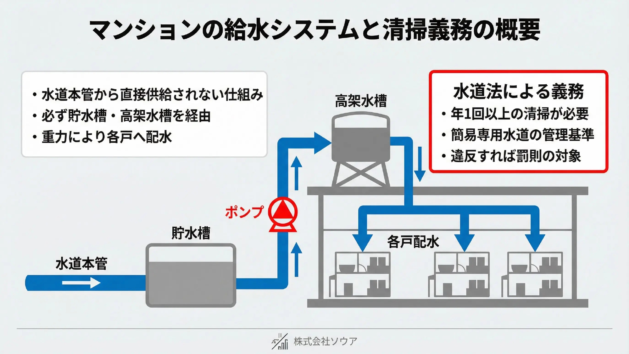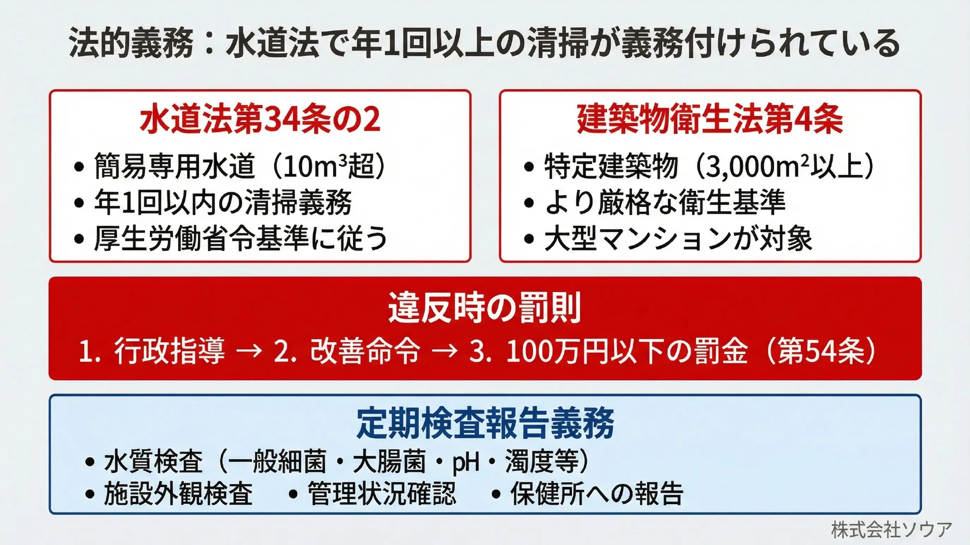 ①法的義務:水道法で年1回以上の清掃が義務付けられている