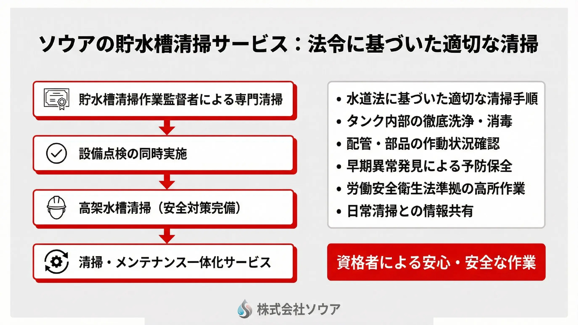 株式会社ソウアでは、貯水槽清掃作業監督者の資格を持つスタッフが、水道法に基づいた適切な清掃を実施します。
