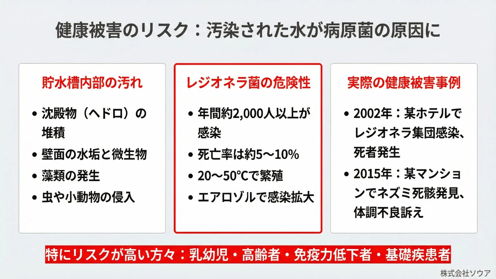 汚染された貯水槽では、レジオネラ菌や大腸菌などが繁殖し、重篤な健康被害を引き起こす危険がある。