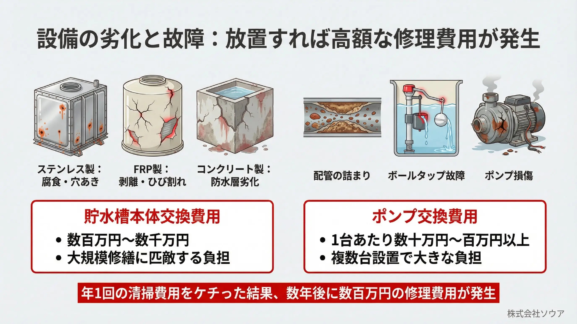 定期清掃を怠ると、貯水槽や関連設備が劣化し、将来的に高額な修理・交換費用が発生する。
