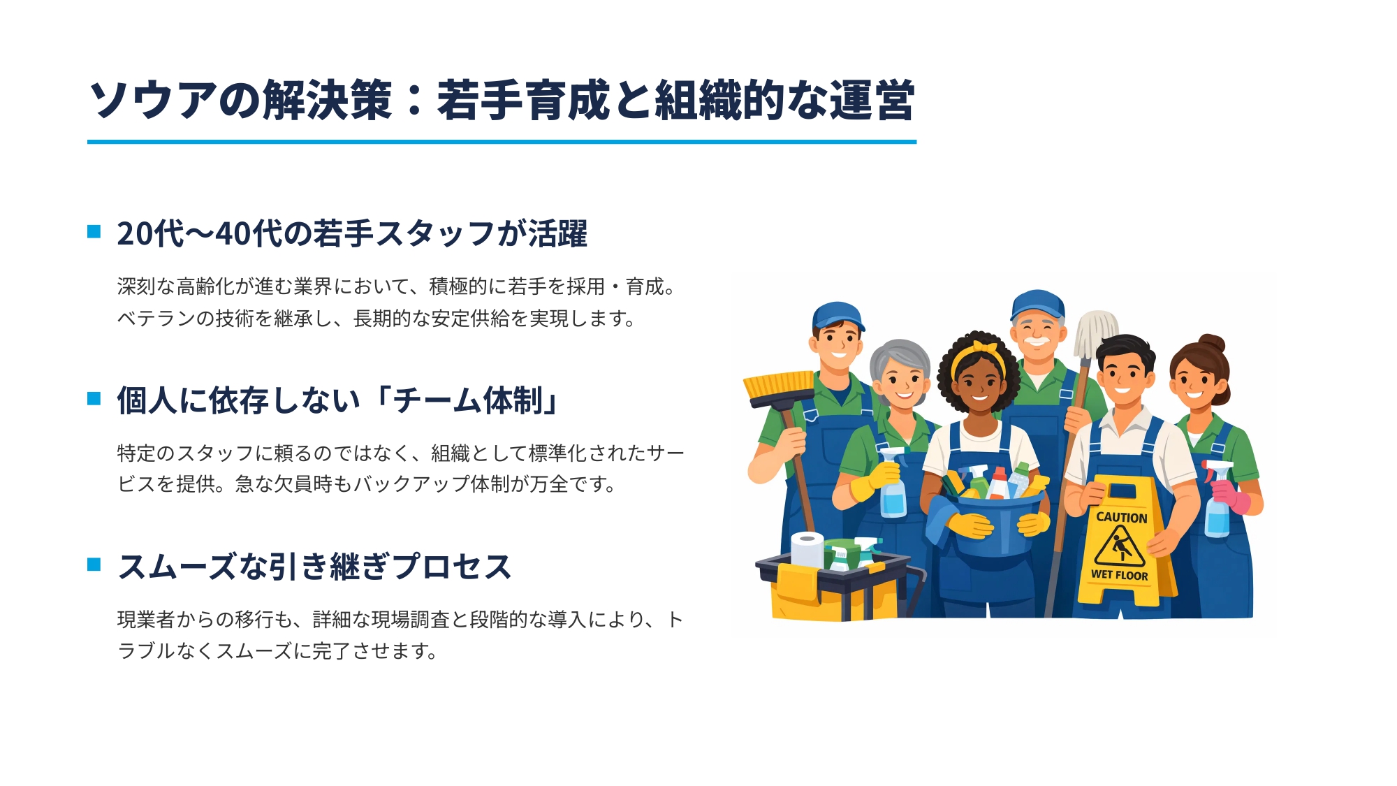 高齢の経営者が運営する清掃会社では、以下のようなリスクがあります。