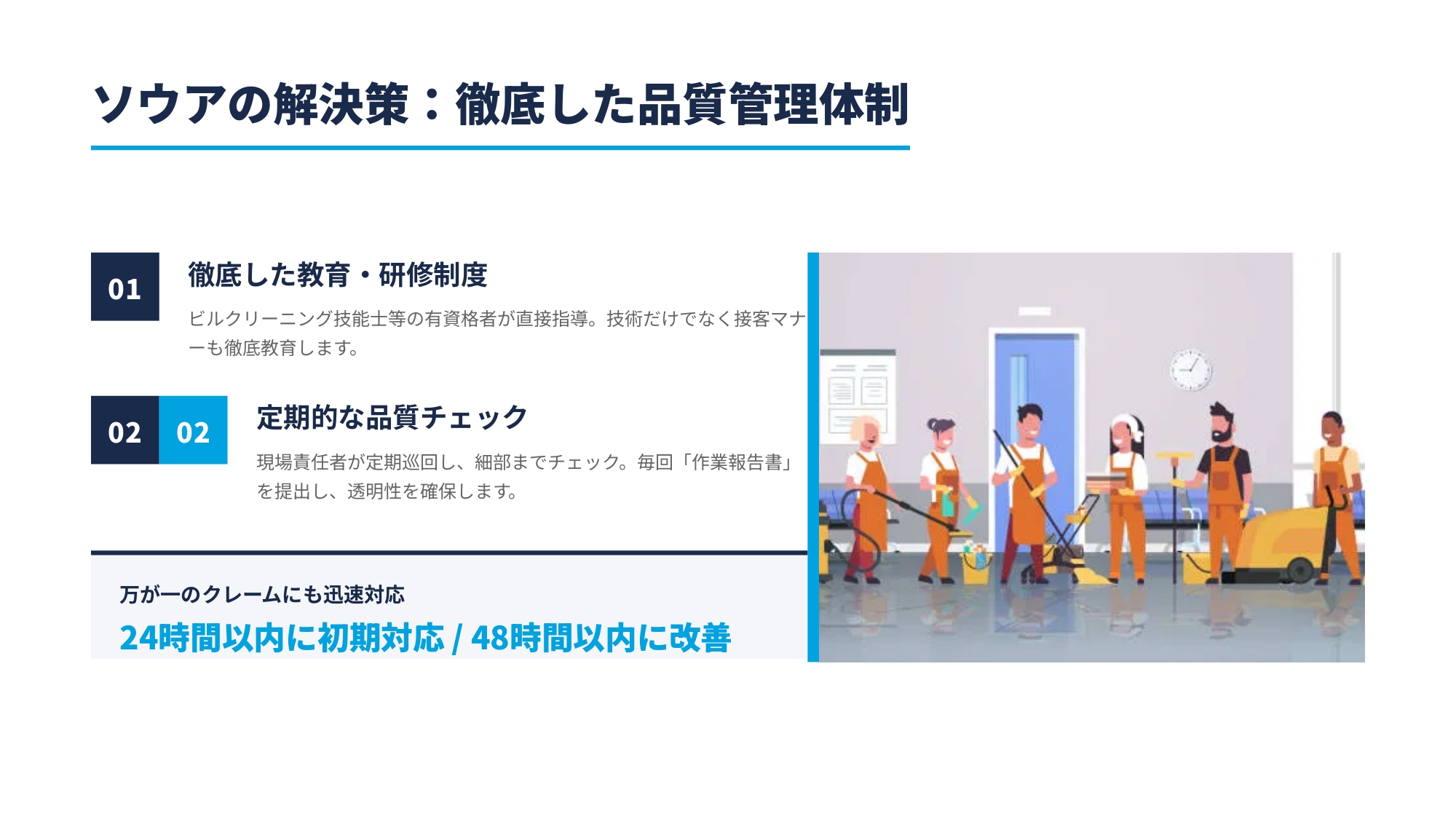 ビル清掃のプロフェッショナルとして、オーナー様の疑問や悩みに誠実にお答えします。