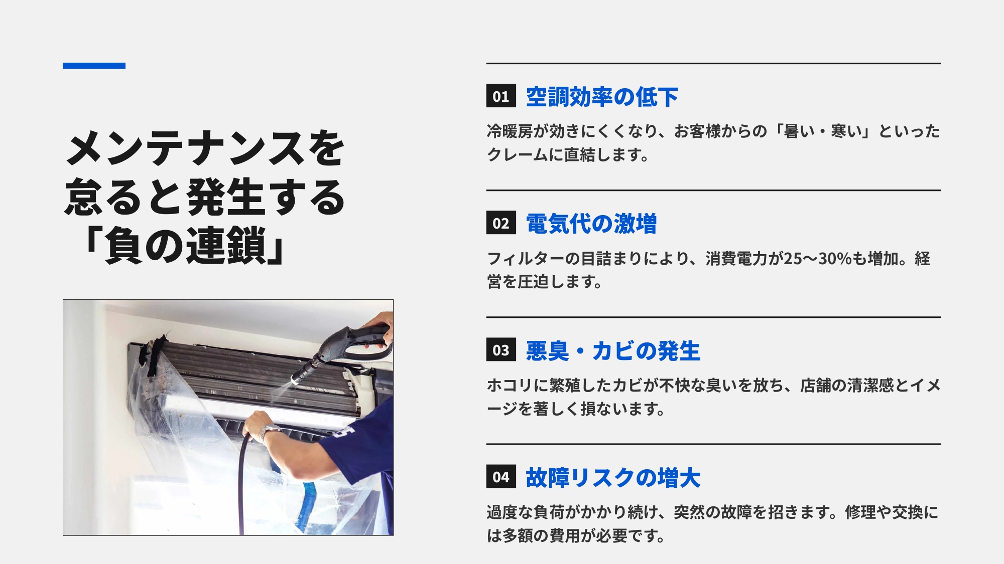 お客様からの「エアコンが効かない」「部屋が暑い/寒い」といったクレームにつながります。