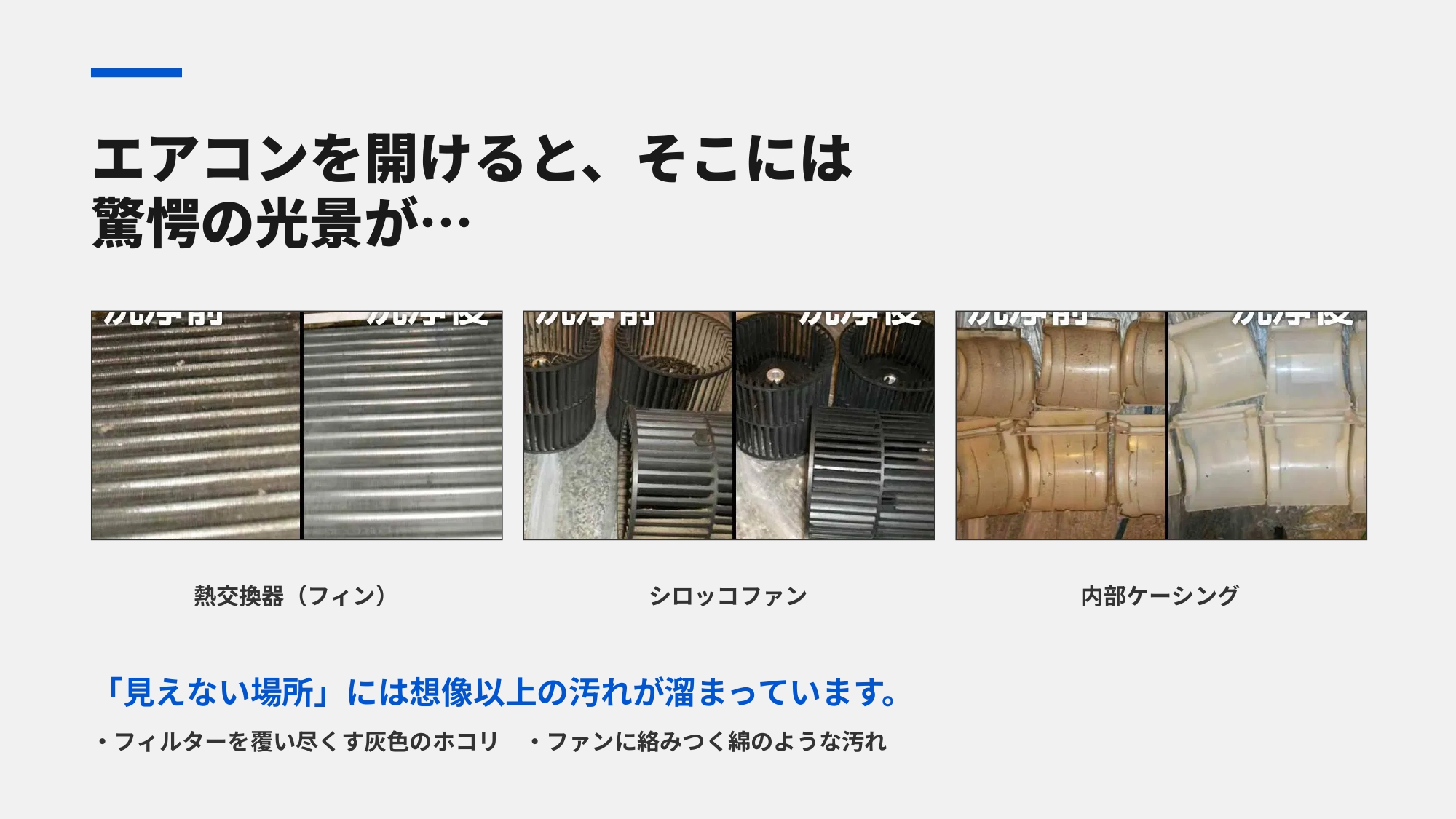 蓄積したホコリ、カビ、タールなどを根こそぎ除去し、新品同様の状態に蘇らせます。