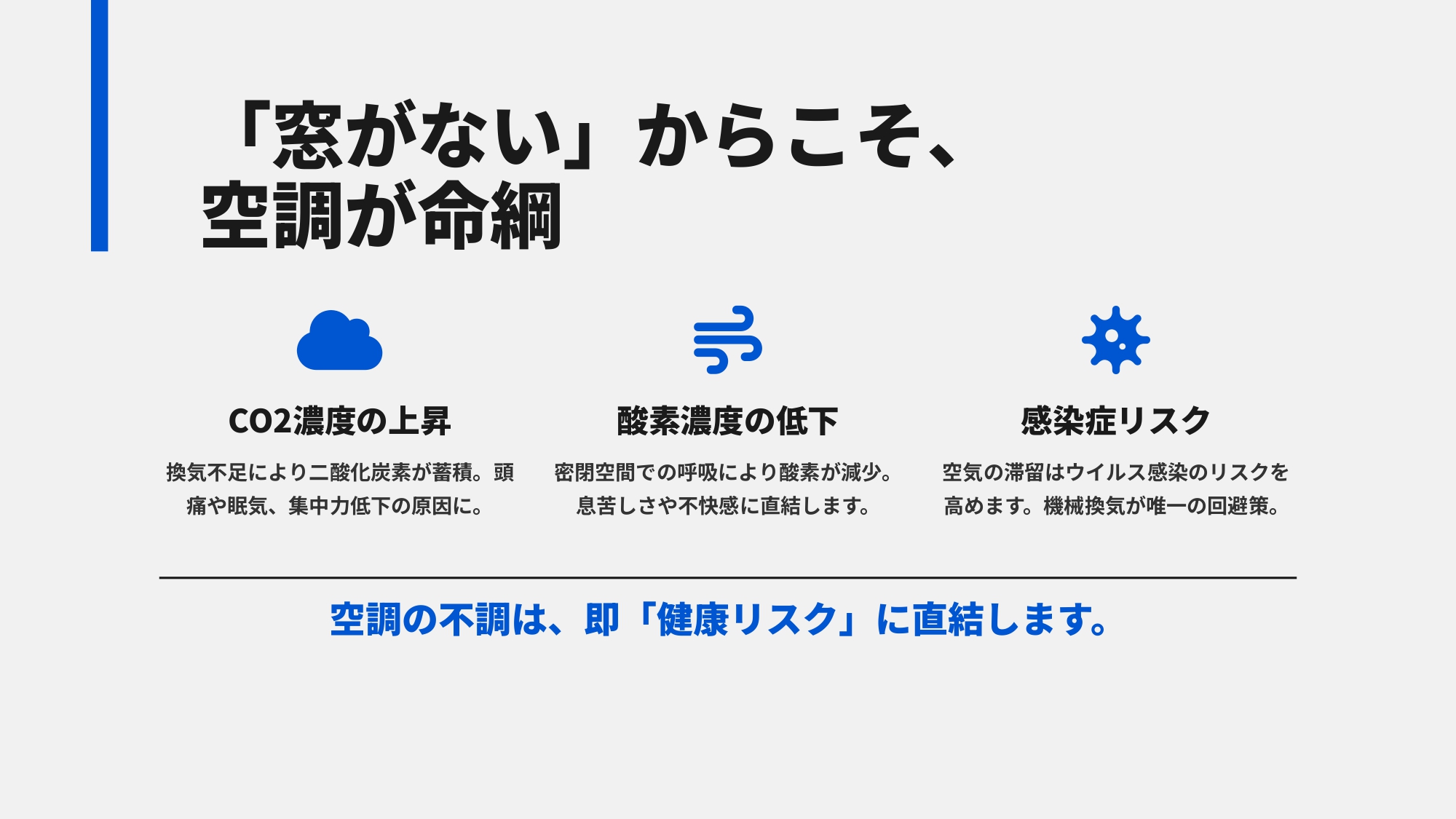 窓のない密閉空間では、自然換気ができません。そのため、機械的な換気・空調設備が唯一の空気循環手段となります。