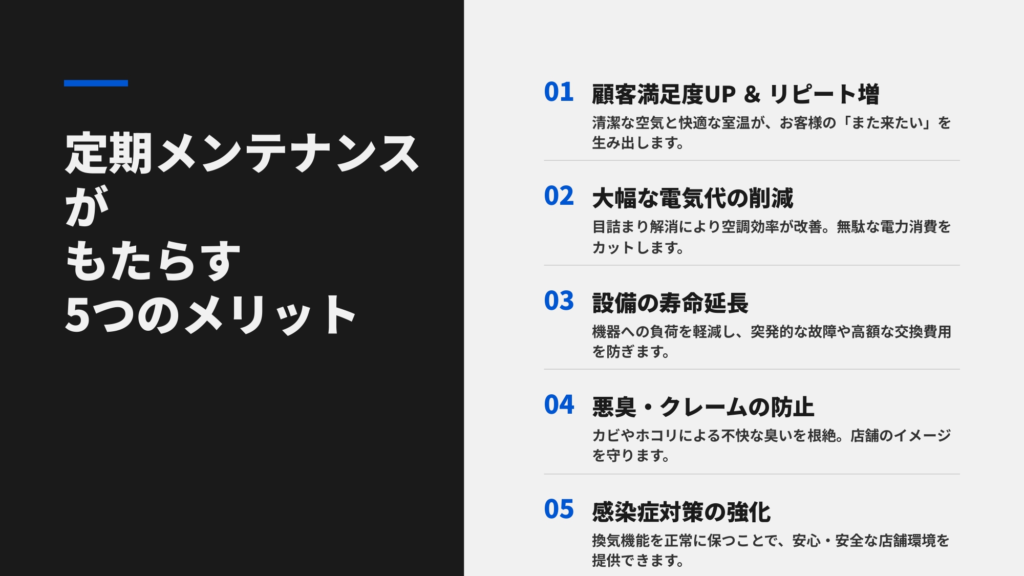 家庭用エアコンと同様に、フィルターの奥にある熱交換器、送風ファン、ドレンパンなどは、一般の方では清掃が困難です。専門の技術と機材を持つプロに依頼することで、内部まで徹底的にきれいにできます。