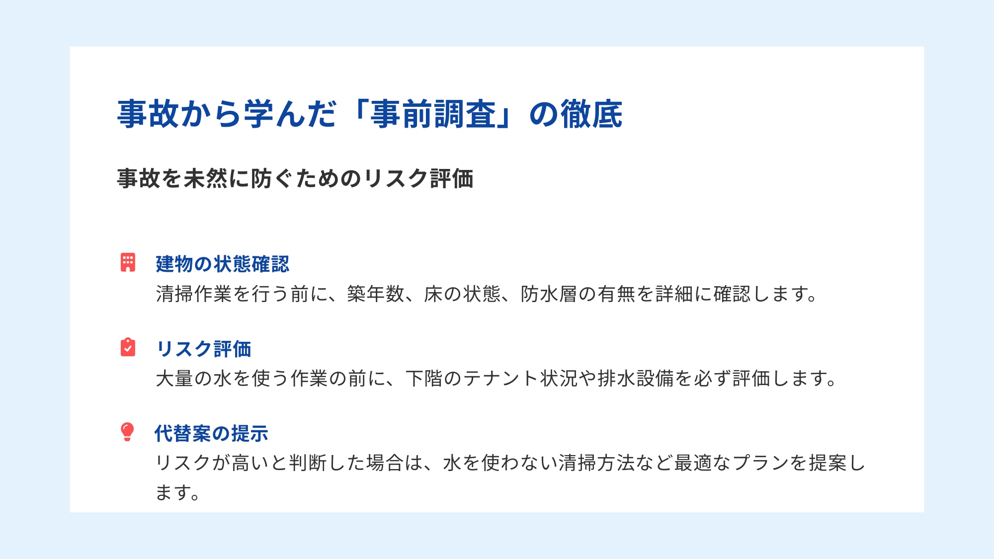 事故後、私たちは清掃作業におけるリスクについて、お客様に事前に説明することを徹底するようになりました。