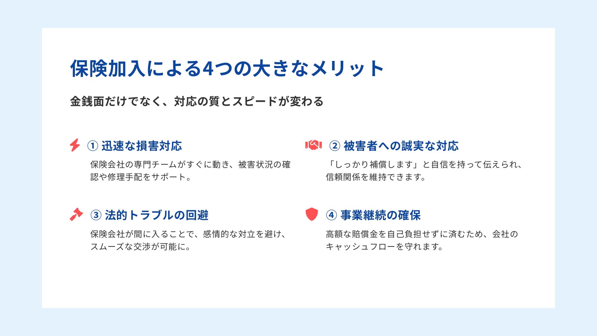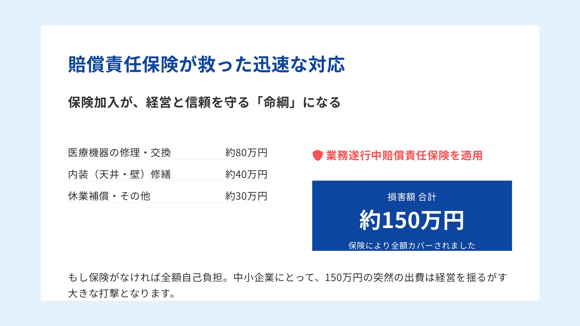 もし保険に加入していなければ、この金額を全額自己負担しなければなりませんでした。中小企業にとって、150万円の突然の出費は、経営を揺るがす大きな打撃です。