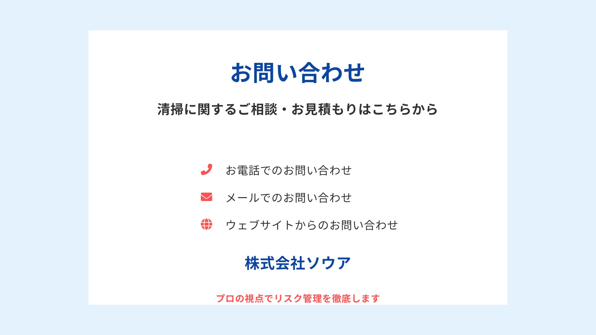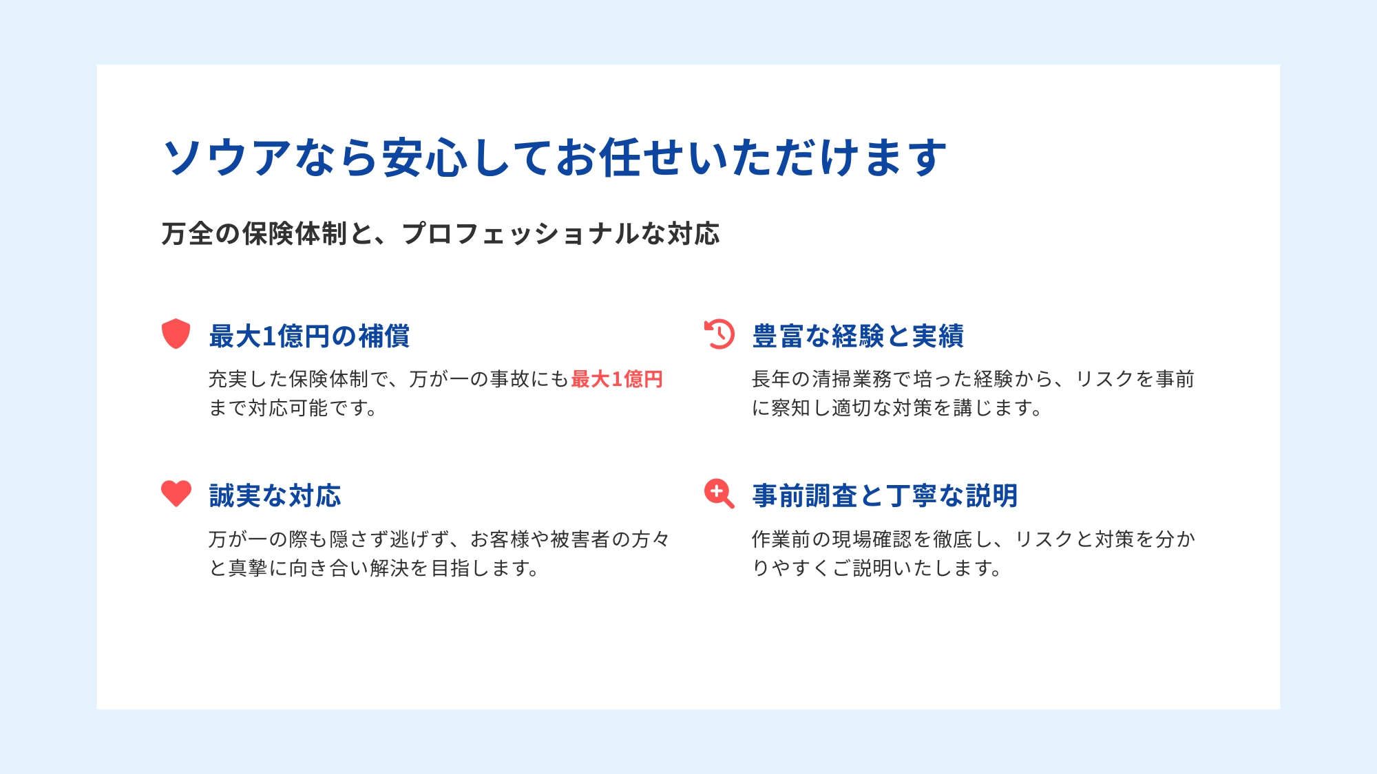株式会社ソウアは、これからも保険による万全の体制と、プロフェッショナルとしての高い意識を持って、清掃業務に取り組んでまいります。