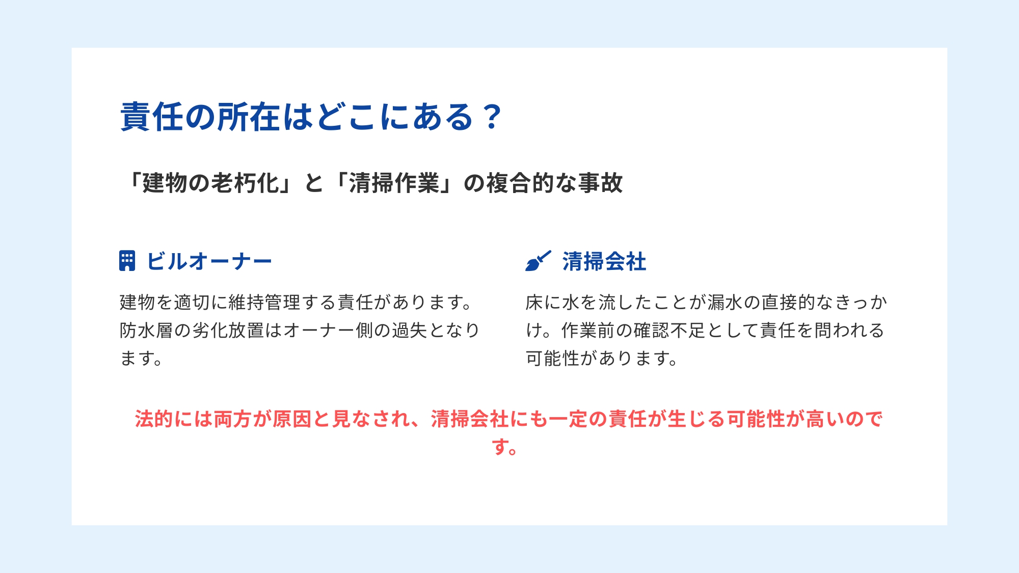 このような場合、法的には「建物の老朽化」と「清掃作業」の両方が原因となった複合的な事故と見なされます。責任割合は、状況により判断されますが、清掃会社にも一定の責任が生じる可能性が高いのです。