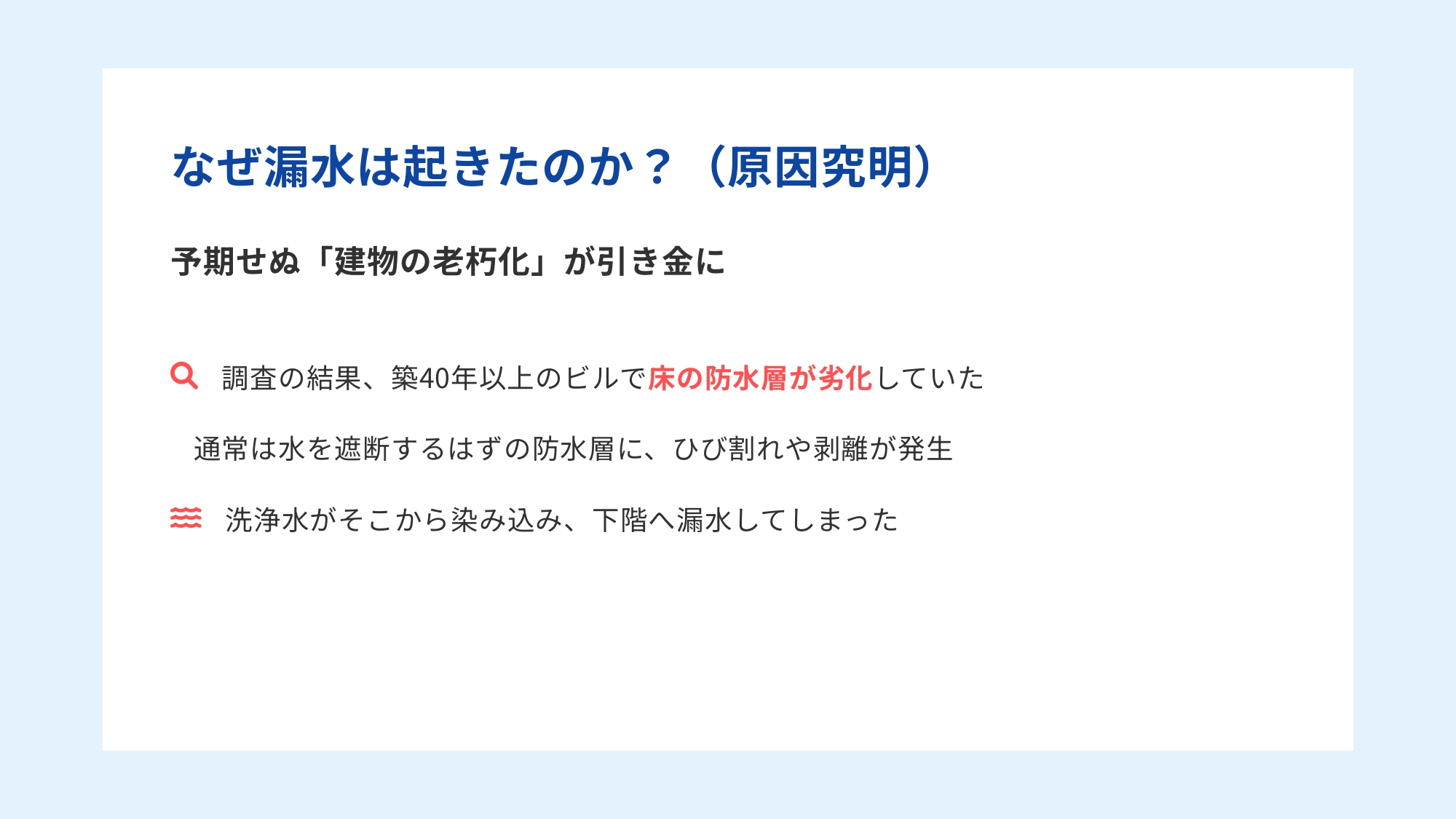 調査の結果、原因は建物の老朽化による床の防水層の劣化でした。