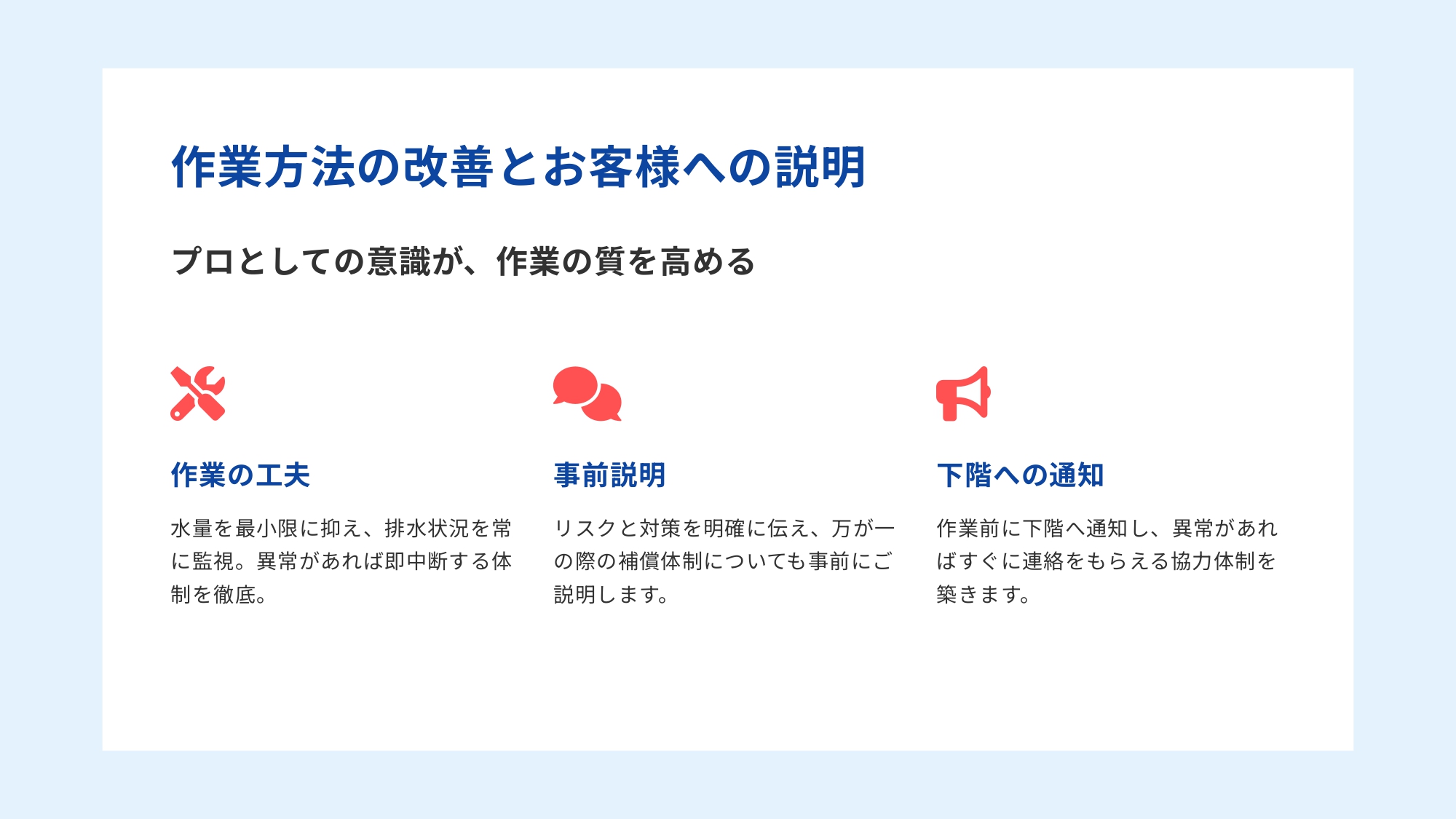 水を使う作業を行う際は、事前に下階のテナントに通知し、異常があればすぐに連絡してもらえる体制を整えます。