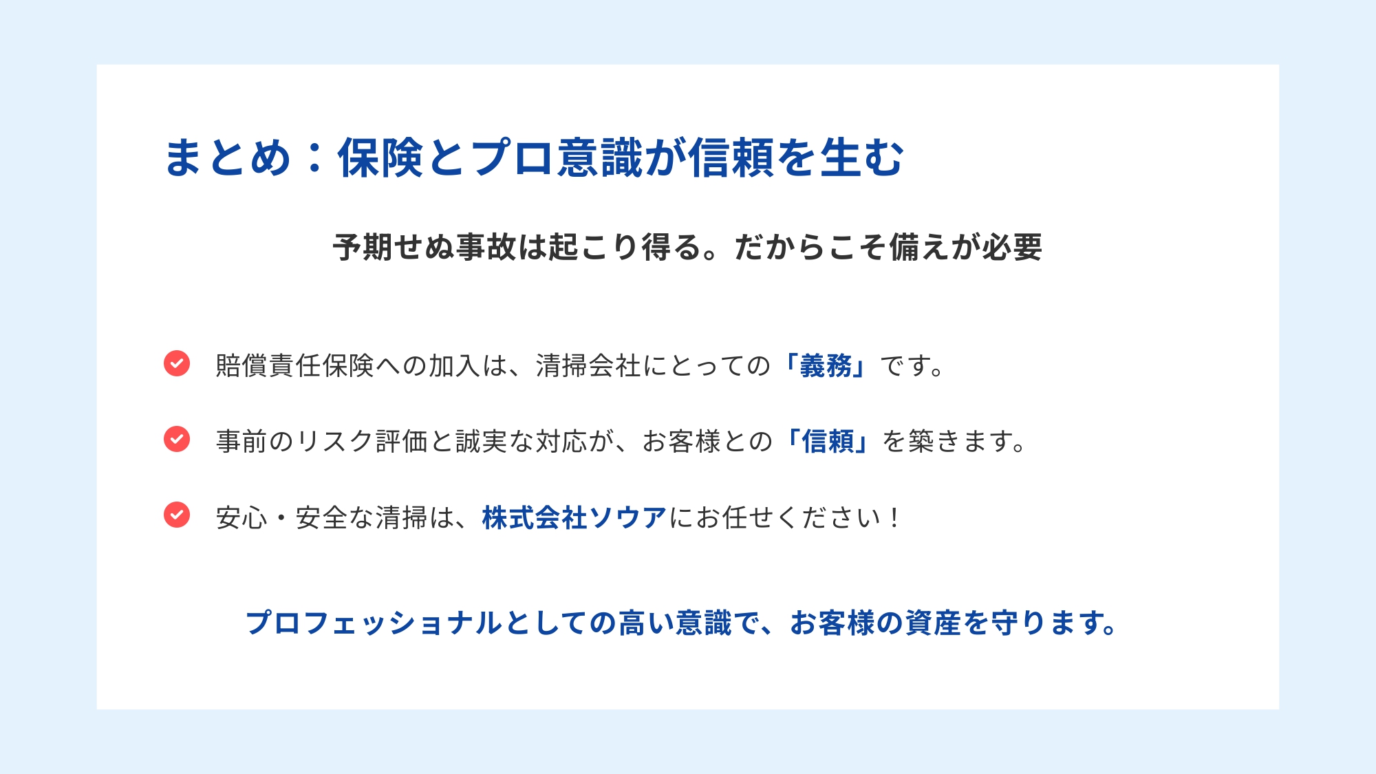 清掃会社をお探しの際は、ぜひ「賠償責任保険に加入しているか」を確認してください。それが、安心してお任せいただける業者を選ぶための、最も重要なポイントです。