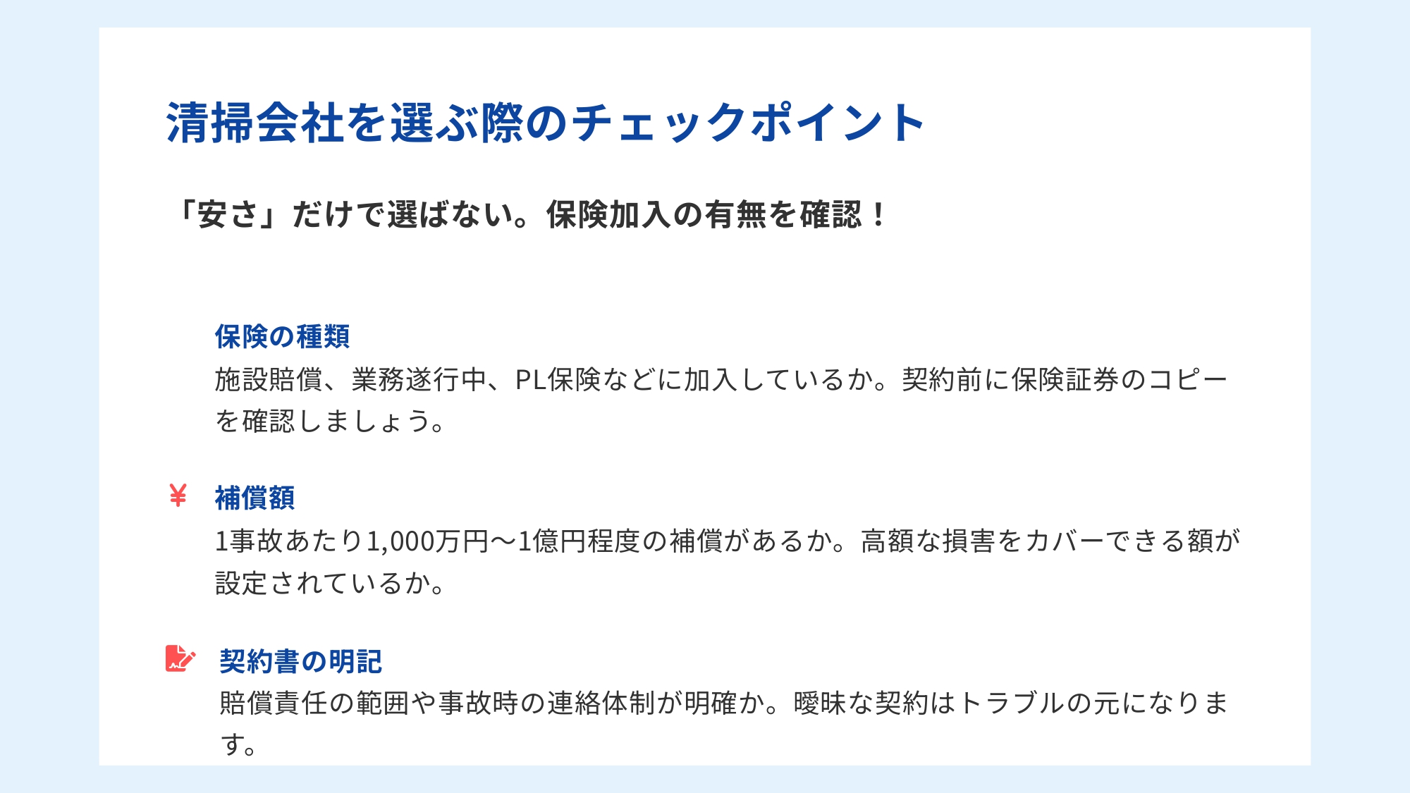 清掃会社を選ぶ際、最も重要なのは「賠償責任保険に加入しているか」です。